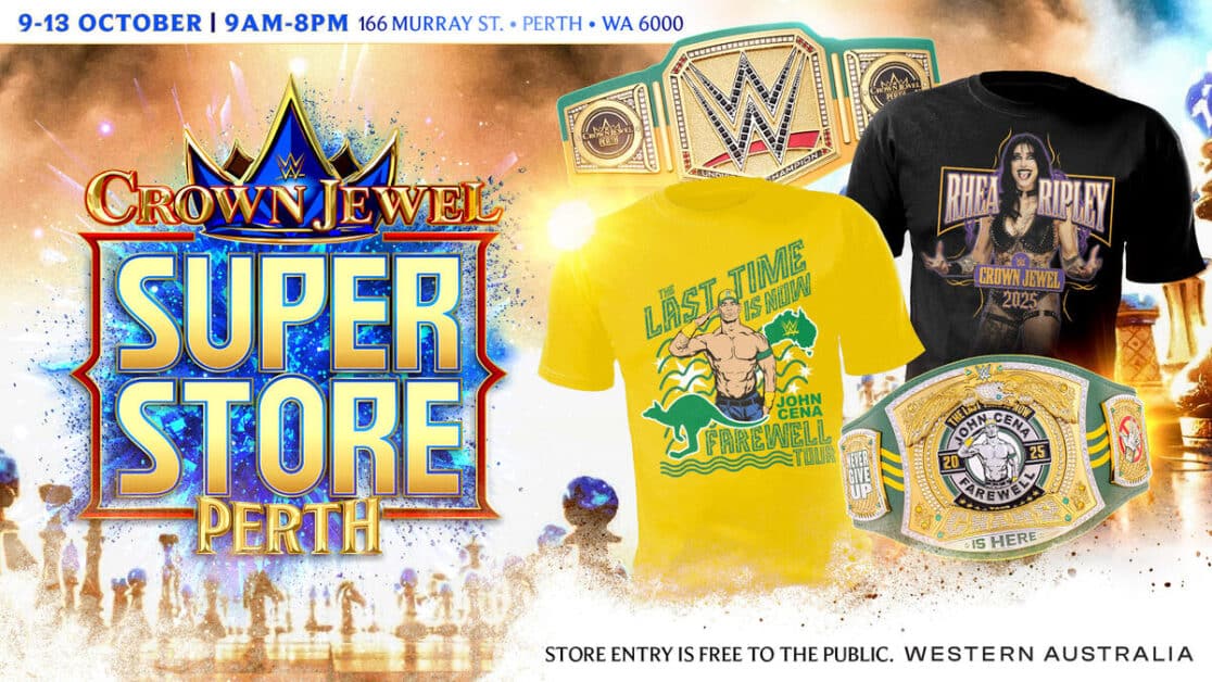 आधिकारिक WWE क्राउन ज्वेल सुपरस्टोर पर्थ, पश्चिमी ऑस्ट्रेलिया अक्टूबर 9 – अक्टूबर 13 में आ रहा है। एक छत के नीचे क्राउन ज्वेल मर्चेंडाइज के सबसे बड़े संग्रह की खरीदारी करें।
