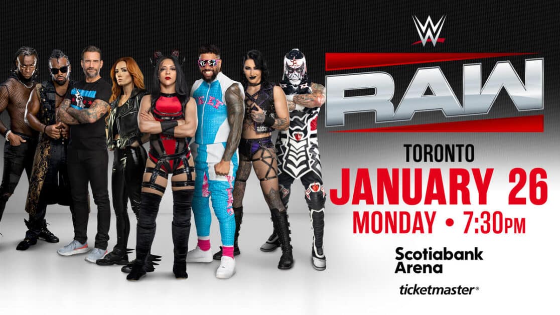 इसके अतिरिक्त, मंडे नाइट रॉ सोमवार, 26 जनवरी को टोरंटो में एमएलएसई के स्कॉटियाबैंक एरेना में वापस आएगा। डब्ल्यूडब्ल्यूई सुपरस्टार रविवार, 25 जनवरी और मंगलवार, 27 जनवरी को टोरंटो मेपल लीफ्स गेम्स में उपस्थित होंगे, जिसमें टोरंटो की खेल हस्तियां भी मंडे नाइट रॉ में उपस्थित होंगी, जो दुनिया भर में नेटफ्लिक्स पर लाइव प्रसारित होगी।