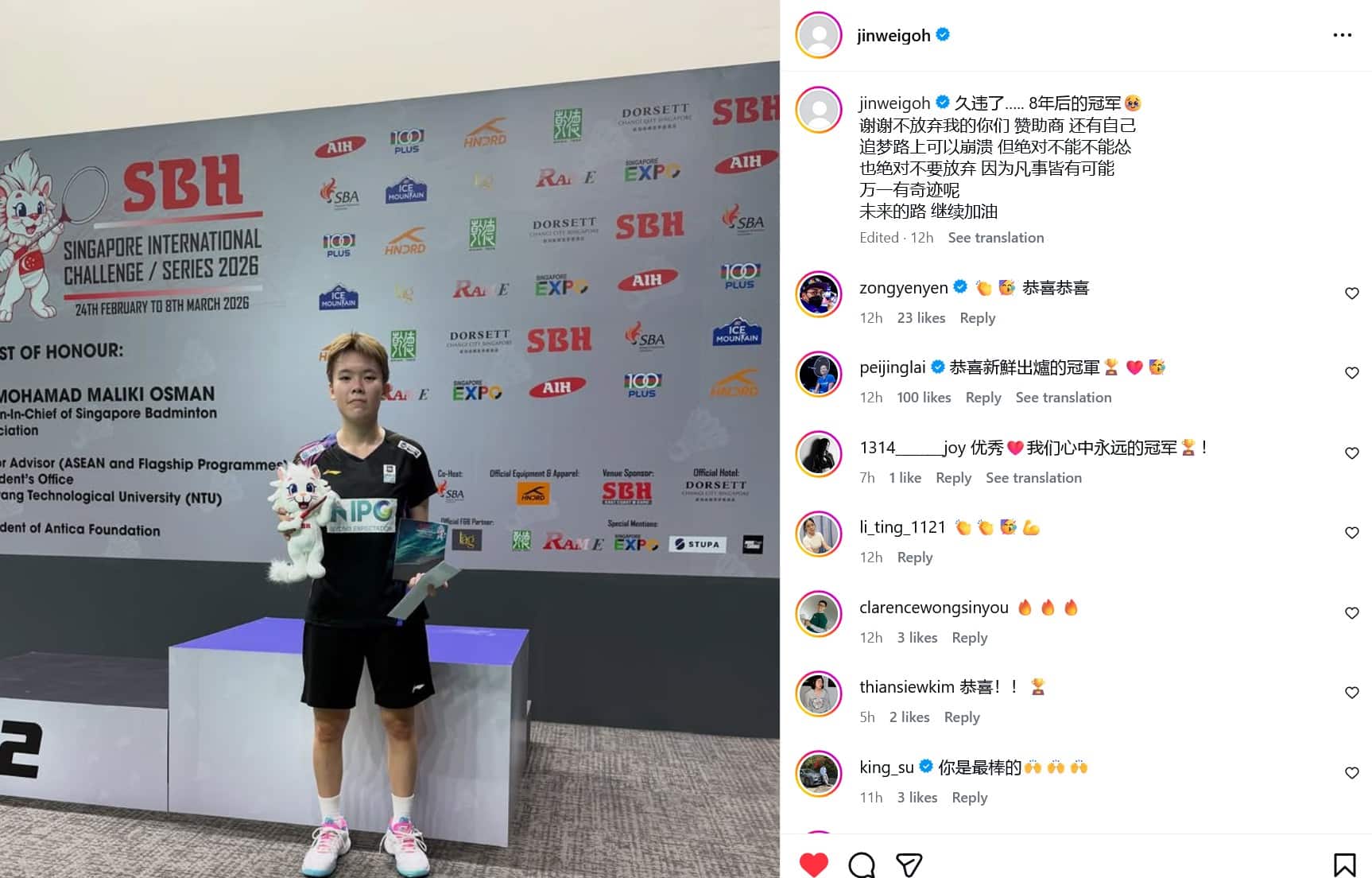 गोह जिन वेई ने सिंगापुर इंटरनेशनल चैलेंज 2026 में महिला एकल बैडमिंटन खिताब जीतने का जश्न मनाया। (फोटो: गोह जिन वेई के आईजी)