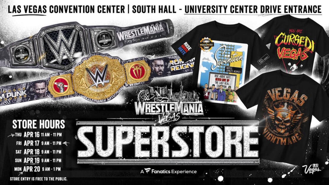 आधिकारिक रेसलमेनिया 42 सुपरस्टोर गुरुवार, 16 अप्रैल से सोमवार, 20 अप्रैल तक लास वेगास लौटता है। लास वेगास कन्वेंशन सेंटर के साउथ हॉल में स्थित, डब्ल्यूडब्ल्यूई यूनिवर्स द शोकेस ऑफ द इम्मोर्टल्स के लिए तैयार हो सकता है और सुपरस्टोर में अंतिम रेसलमेनिया 42 माल का स्कोर कर सकता है। 60,000 वर्ग फुट से अधिक में, यह अब तक का सबसे बड़ा रेसलमेनिया सुपरस्टोर है, जो विशिष्ट परिधान, प्रीमियम ब्रांड सहयोग, प्रतिकृति शीर्षक और आवश्यक संग्रहणीय वस्तुओं से भरा हुआ है, जो इसे रेसलमेनिया सप्ताह का जश्न मनाने वाले प्रशंसकों के लिए अंतिम गंतव्य बनाता है।